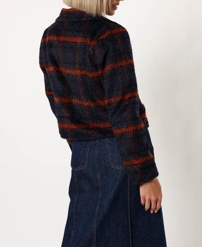This piece is all about making a statement with its Navy plaid fabric. With a snappy collar, sleek long sleeves, and a smooth front zip closure, it's the perfect blend of playful and practical.
